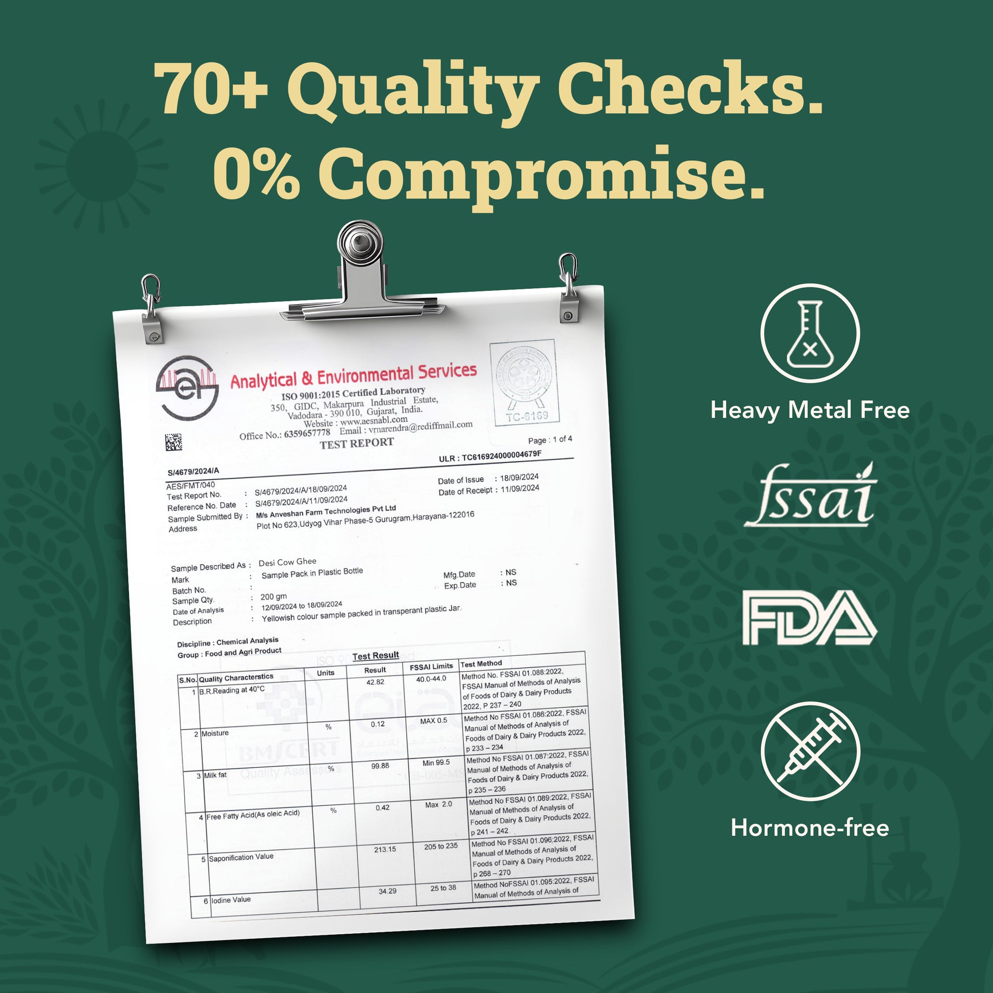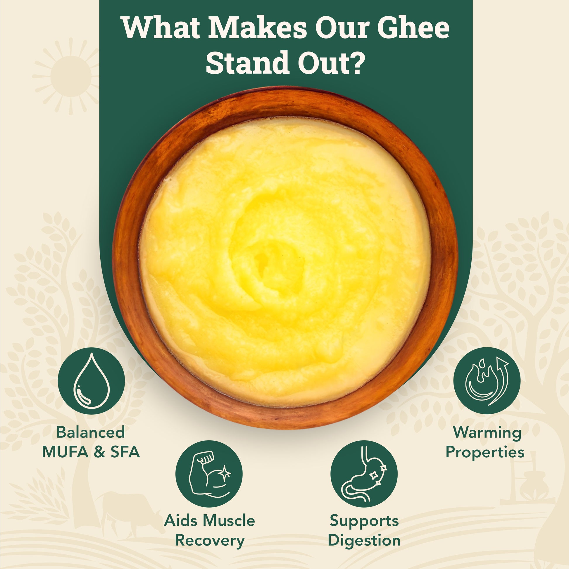 Our ghee is obtained by churning curd and not cream (malai). So the nutritional content is more as compared to others. Therefore our ghee tastes a lot tastier and aromatic because it preserves the all-natural nourishment of ghee.