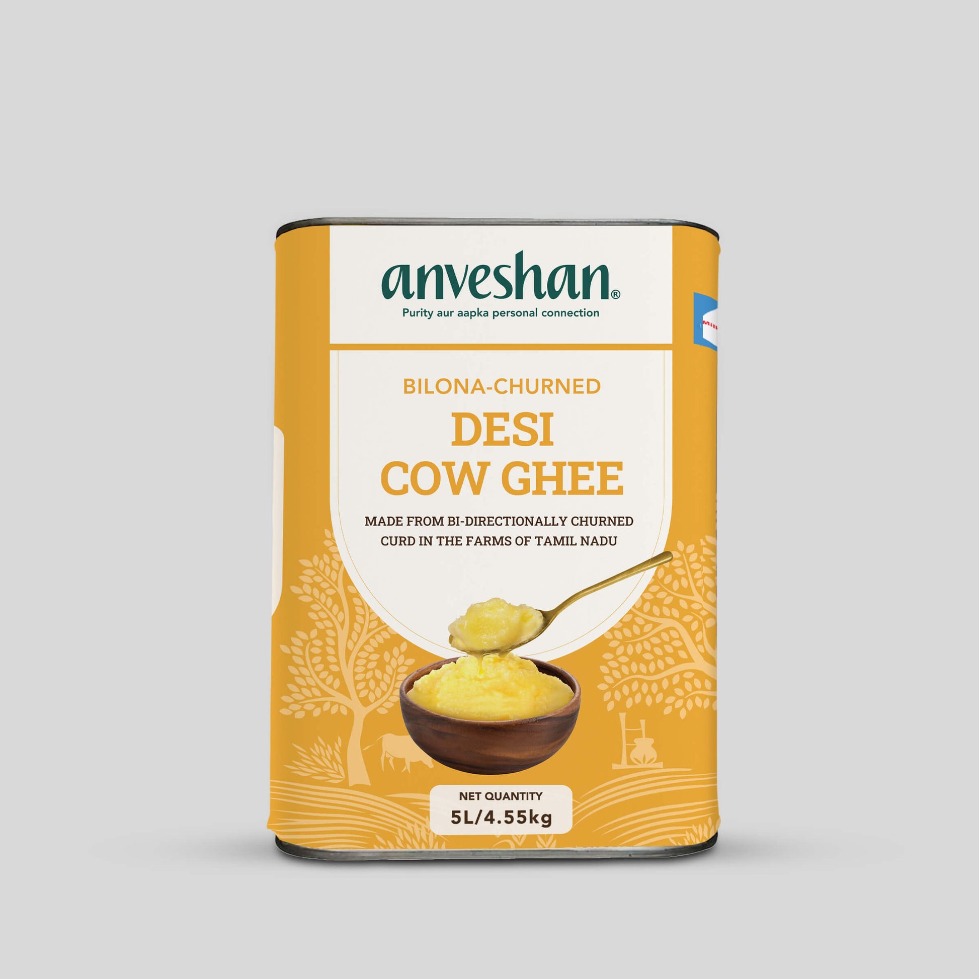 Anveshan A2 Desi Cow Ghee is made entirely from the milk extracted from desi cows. The indigenous cow gives around 2-3 litres of milk per day which is more nutritious than foreign breeds that produce more milk. The cows are neither forced nor injected with hormones to enhance milk production. Our ghee is bi-directionally bilona churned with a wooden churner. This is why our A2 cow ghee has a grainy ure thicker consistency tempting aroma superior flavour and is much healthier. Hence A2 Desi Cow Ghee is costlier and better than regular ghee.
