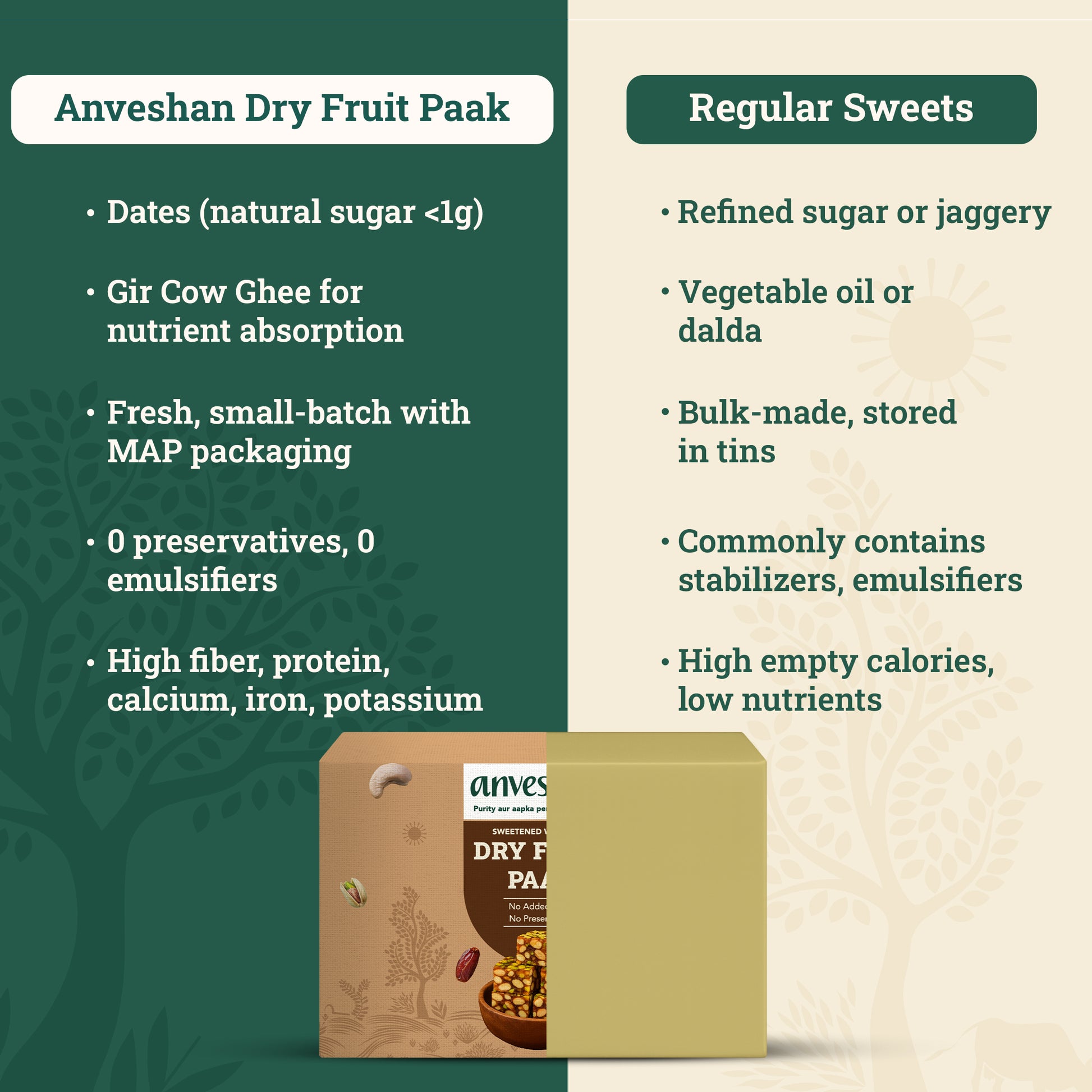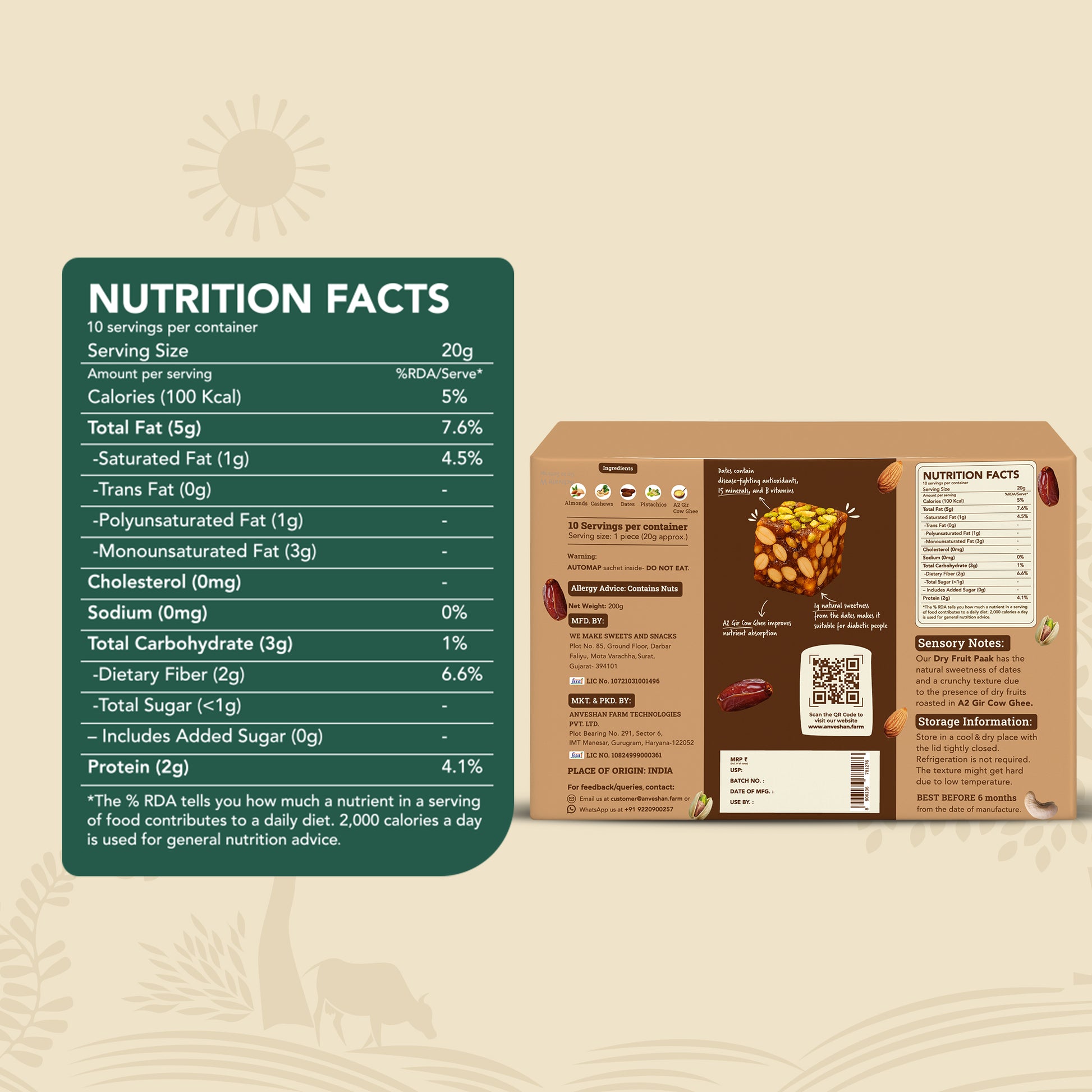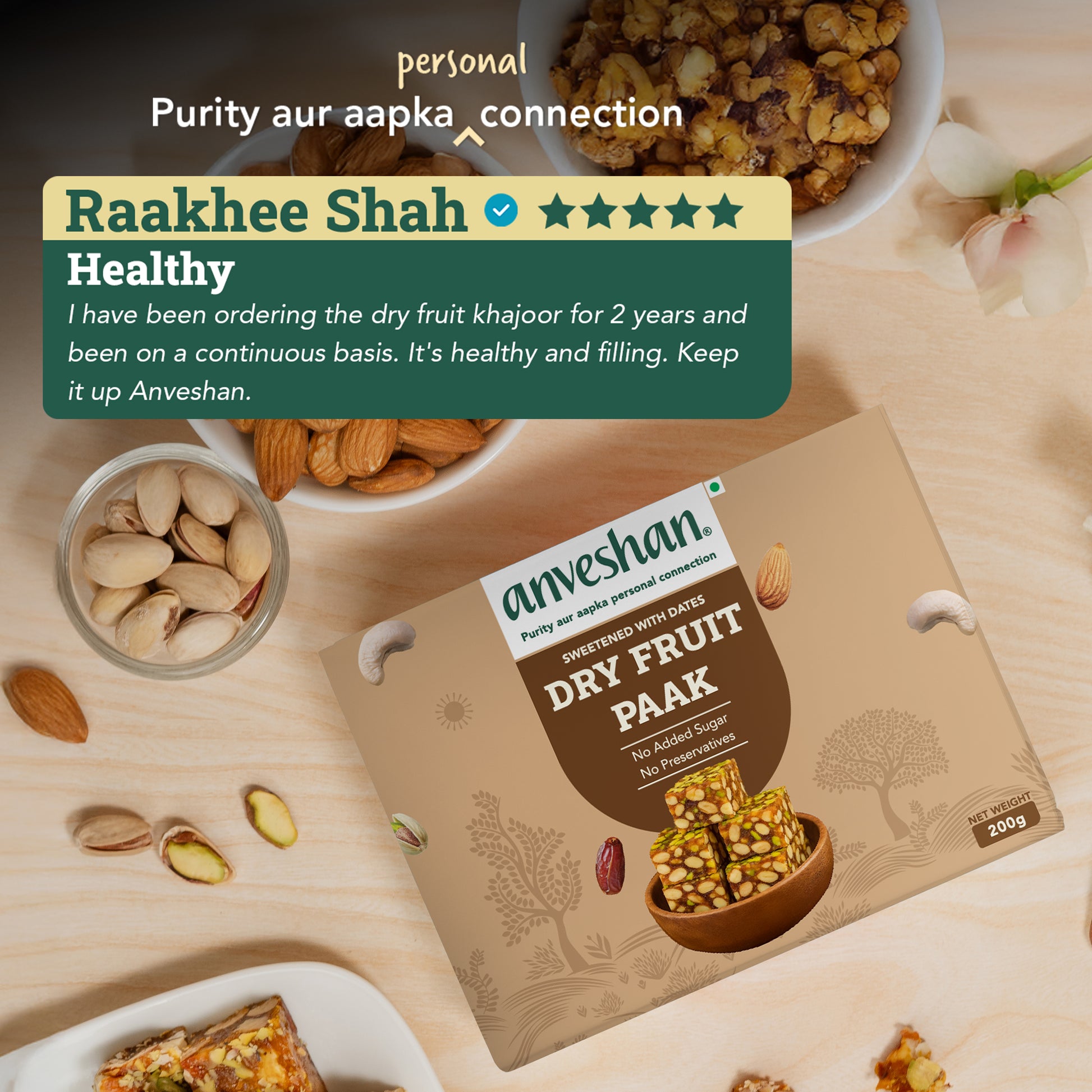 Our Dry Fruit Paak has less than 1 gram of sugar per paak. That, too, is the natural sugar of dates, not refined sugar, so your every bite is guilt-free and diabetic-friendly.