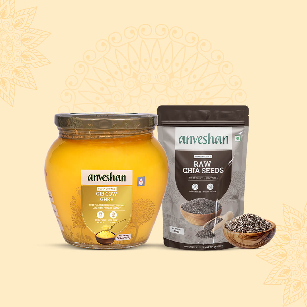 Power up your day with the richness of A2 Gir Cow Ghee and the superfood benefits of Chia Seeds. A health-packed combo made just for you!