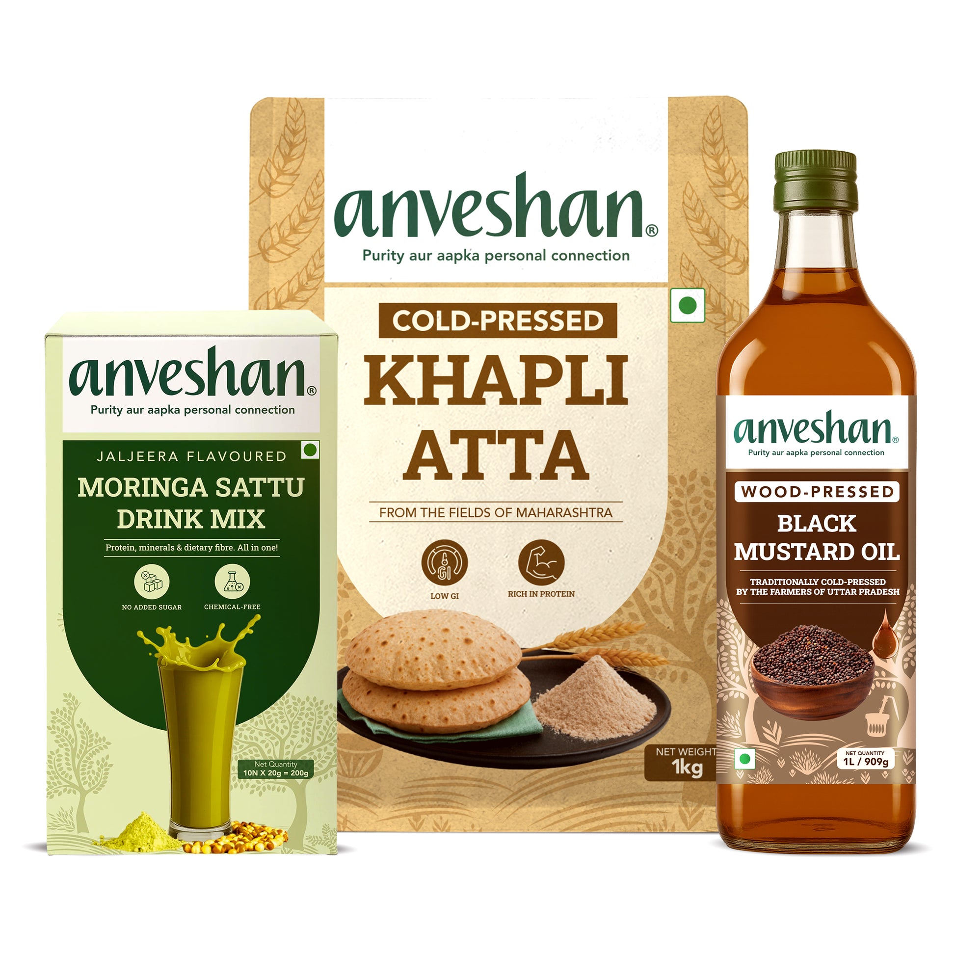 A wholesome daily nutrition combo rooted in traditional Indian wellness. Wood-pressed Black Mustard Oil enhances cooking with natural antioxidants, Khapli Atta delivers ancient-grain nutrition for better digestion, and the Moringa Sattu Drink Mix offers a clean, plant-based energy boost. Ideal for families seeking purity, strength, and balanced nourishment in every meal.