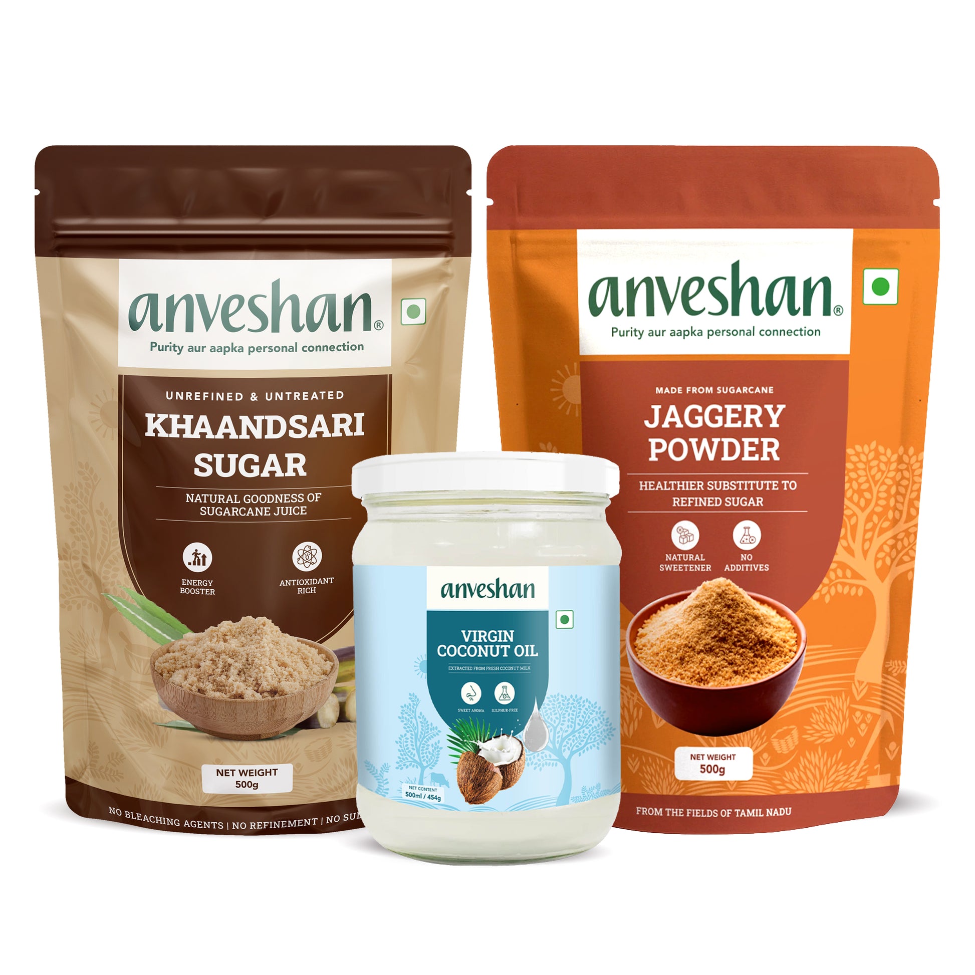 A clean and natural kitchen essentials combo crafted for healthier cooking and everyday sweetness. Cold-pressed Virgin Coconut Oil supports better digestion and metabolism, while mineral-rich Jaggery Powder and traditionally made Khaandsari Sugar offer pure, unrefined sweetness without additives. Ideal for mindful families choosing authenticity over processed alternatives.