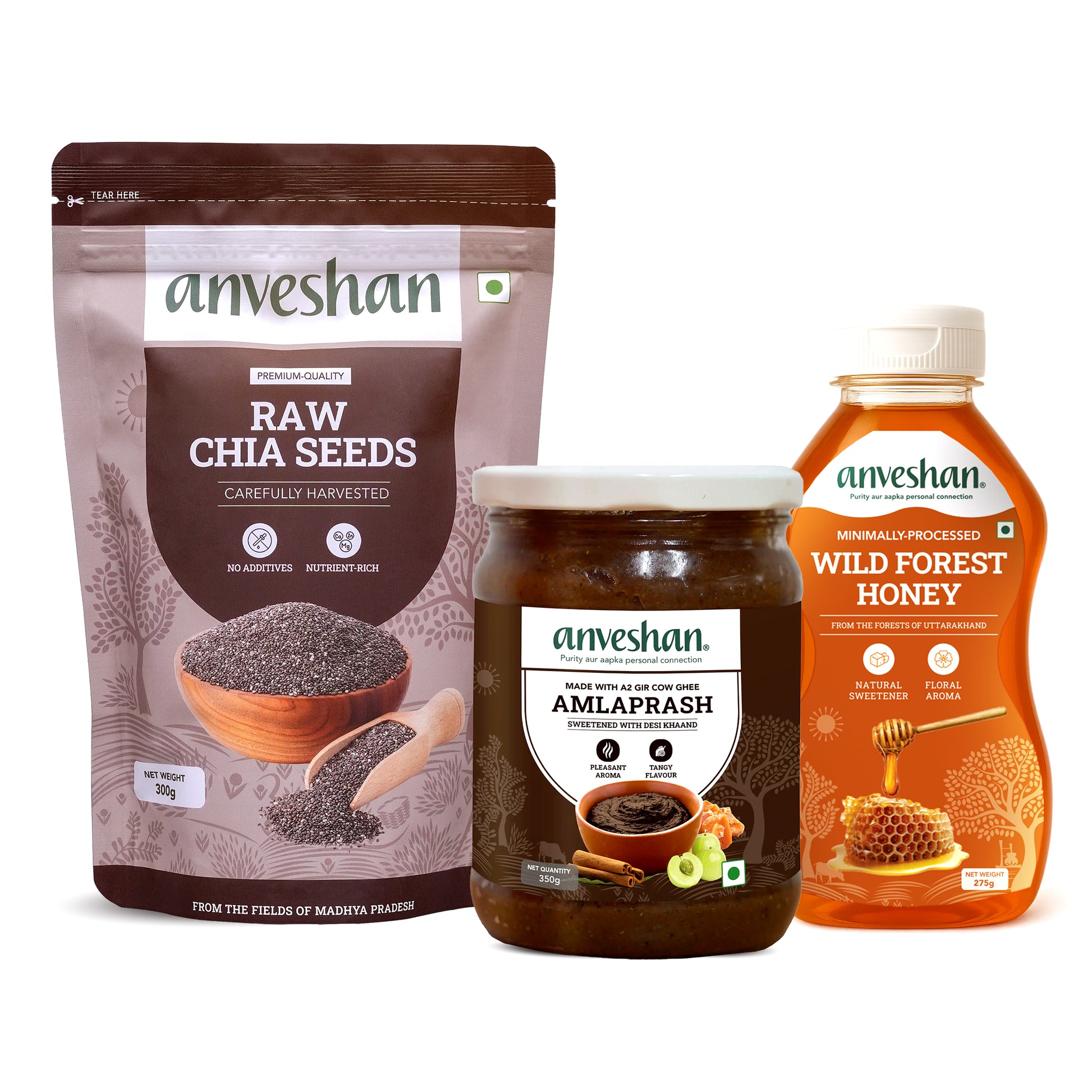 A daily wellness trio designed to strengthen immunity, improve digestion, and support sustained energy. Amlaprash delivers antioxidant-rich amla goodness, Honey adds natural sweetness and relief from seasonal discomfort, and Raw Chia Seeds provide clean plant protein and omega-3 nutrition to power your day.