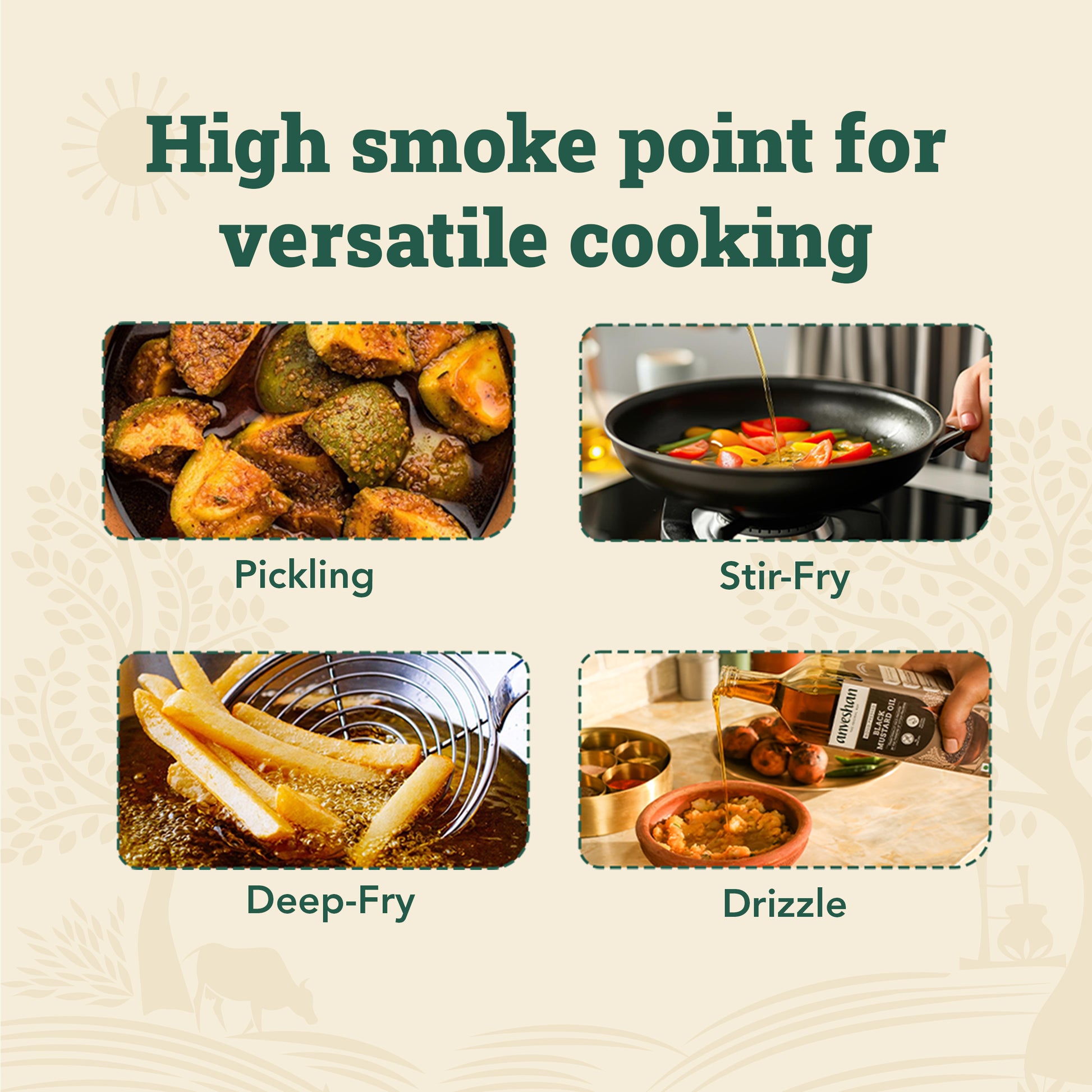 Carefully extracted using the traditional Kohlu-pressing technique in the farms of Uttar Pradesh, this oil offers a distinct pungency that enhances the taste of your favourite dishes. Power-packed with omega-3 fatty acids and natural antimicrobial properties, it is known for numerous health benefits, making it a treasure trove of flavour and tradition.